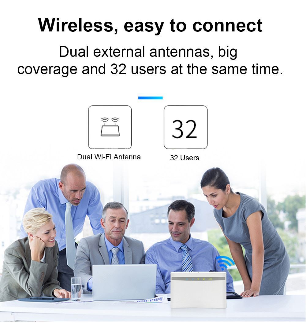 Sa a se yon trè avanse LTE andedan kay la CPE routeur. Li fèt pou satisfè bezwen done entegre ak aksè Wi-Fi pou itilizatè rezidansyèl, biznis ak antrepriz. (ka konekte ak SMA connecteur antèn ekstèn!) 150M gwo vitès, LTE FDD: DL / UL 150M / 50 Mbps (Cat 4). Transfere 4G nan Wi-Fi, pa bezwen aksè bande, mete yon kat sim, ploge epi jwe. WiFi Kouvri tout apatman ak kay, jwi entènèt gwo vitès toupatou. Fasil pou konekte, doub antèn ekstèn, gwo pwoteksyon ak 32 itilizatè an menm tan.
