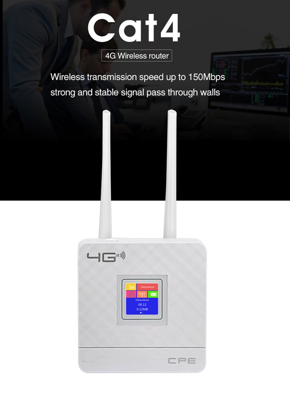 CPE903 se yon wo pouvwa 4G san fil ak 4G plas kat sim ak processeur rezo MIPS, li se yon solisyon pou antrepriz, kay, konpayi, rezo Wi-Fi a. Li nan konpatib ak IEEE 802.11b / g / n estanda, pousantaj done yo rive nan 300Mbps. Avèk doub antèn ekstèn, Wi-Fi siyal se pi estab ak pi long ranje. Li sipòte 10 Wi-Fi itilizatè an menm tan.